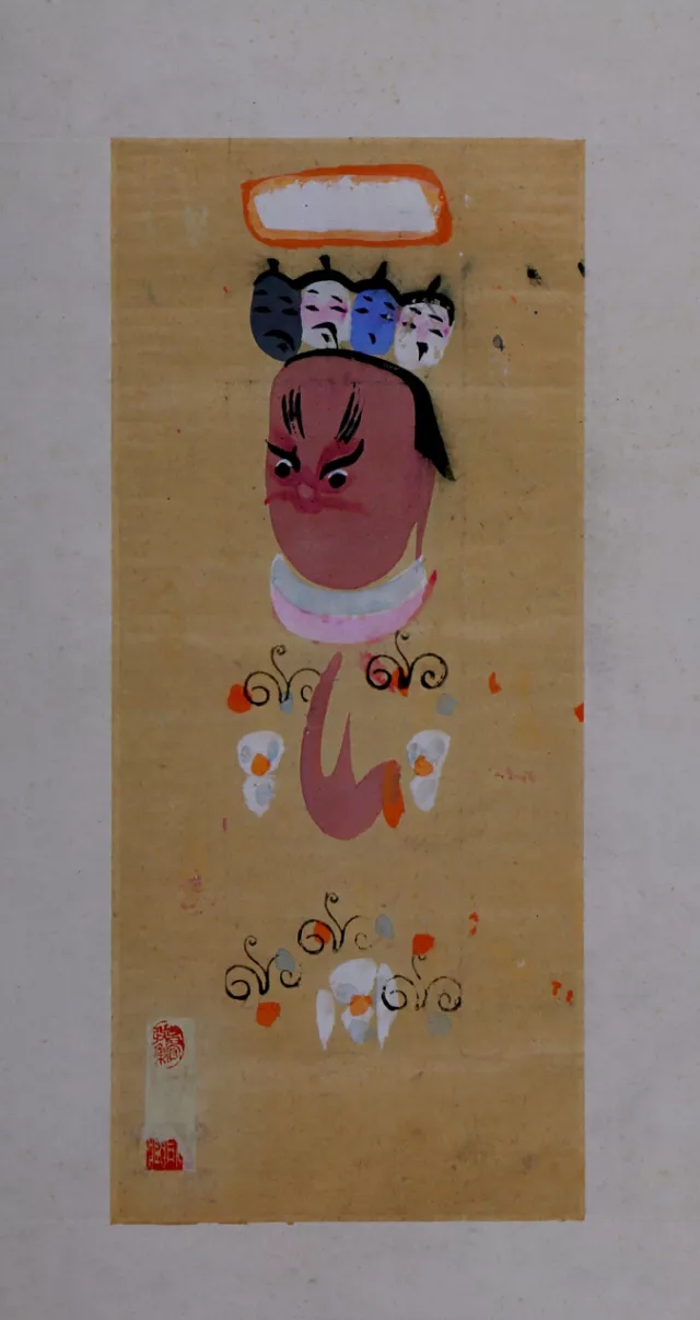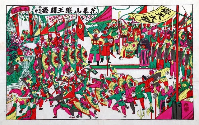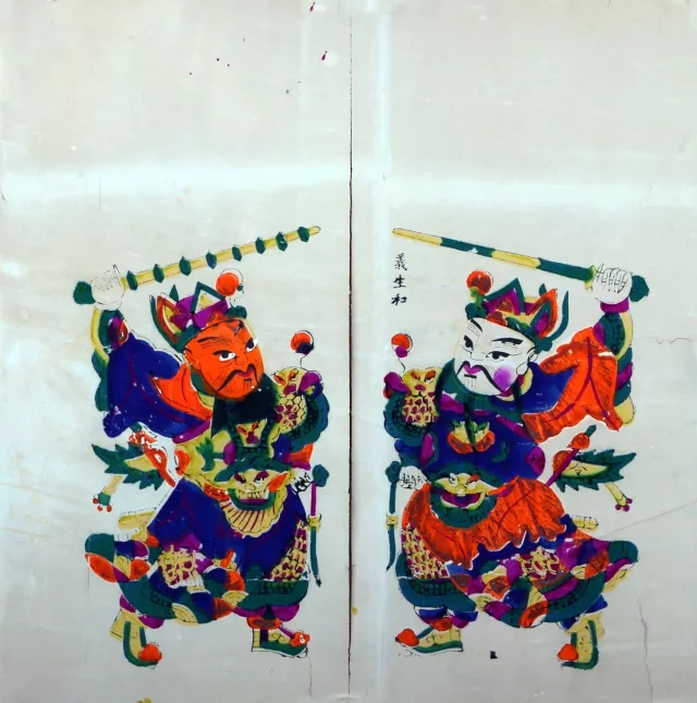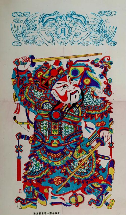 一级文物 这件神马是在淡黄色纸上印成墨线图,然后为图中主神开相着蓝色,身上图案以粉红红、蓝、白色点染而成。 2014年征集。尺寸:纵47.5厘米,横27.2厘米。 民国版江苏无锡神马年画三 一级文物 这件神马是在淡黄色纸上画出神像手脸着暗红色,以红、白、黑色点染五官、胡须与头发,身上仅有图案以蓝、白、黑、桔红色点染而成,余皆从略,头顶四人小头像着灰、白、蓝三色,穿圆领官衣。 2014年征集。尺寸:纵47.5厘米,横27.2厘米。 民国版江苏无锡神马年画 一级文物 这件神马是在粉红色纸上画出神像手脸着淡蓝色,以红、白、黑色点染五官与胡须,身上仅有图案以蓝、白色点染而成,余皆从略,头戴展翅幞头。 2014年征集。尺寸:纵47.5厘米,横27.2厘米。 江苏桃花坞忠义堂年画 清版 二级文物 纸质。忠义堂是《水浒传》中梁山好汉商议军情、调兵遣将、排定座次的地方。忠义堂原叫聚义厅,晁盖在中箭身亡后,宋江成了山寨之主,他便把聚义厅改为忠义堂。这幅年画以戏曲人物的形式画出了22位梁山英雄好汉的形象,并在边上注明其名字和绰号。 民国版 三级文物 滩头镇的这对扬鞭门神,不同于四川或陕西印制者,秦叔宝手中本应是一对铜锏,而这对门神中的秦琼,却拿一柄单锏,这与小说《隋唐演义》的描写不同。图左尉迟恭面作红脸,顶盔披甲,腰插令旗,一手扬鞭,一手按剑,作迈步向前状;图右之秦琼,衣甲头盔相同,只是衣红色,举单锏,右手按剑,与尉迟恭所作工架呈对称式。此图是原版旧印者。 民国版湖南隆回五子门神年画 民国版 三级文物 此幅门神画,因门神前面刻绘五名儿童嬉戏于其间,俗称“五子门神”。门神戴倒缨盔,斜披战袍,外露上甲,背插四旗,一手抱斧钺,一手握铜锏,标志此门神为秦琼。秦琼下有五子,各持一吉祥瑞庆之象征物,以示福庆满门。中间一童子,戴乌纱帽,穿蓝色官衣,抱如意一柄,坐在麒麟背上。后有一童子手擎障扇,表示“状元及第”,考试中取。前有两个童子,一个手举荷花一枝,一个双手捧一雕漆圆盒,乃比作夫妻和睦的“和合二圣”。麒麟尾后,童子戴紫金盔,身穿箭衣,内衬腿裙,如武士,双手捧一侈口朱瓶,瓶中插一系磬之戟,藉其勿名意义,读仁“吉庆平安”。图上印有“信记通生和”字号名章,当是滩头早期门神画作坊之一。 年画根植于民众丰富的生活积淀,成长于年画艺人匠心独运的艺术创造,形象地展示了富有地域特色的民风民俗和人文精神,富有鲜明的地域文化特色。