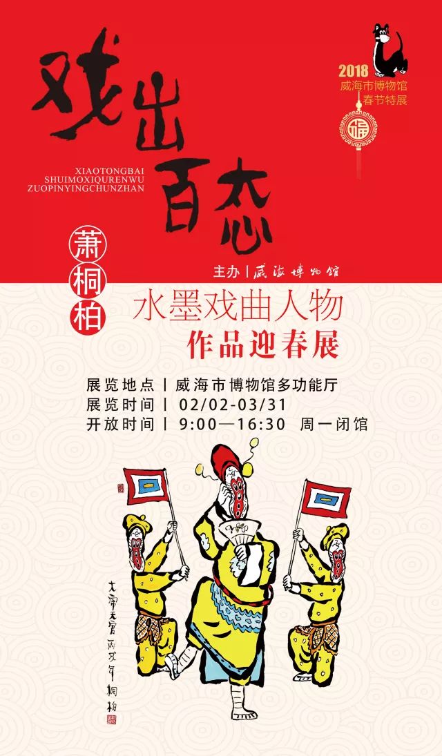 萧桐柏水墨戏曲人物作品迎春展 展览时间:2018年2月2日—3月31日 展览地点:市博物馆多功能厅 前言 习近平同志在十九大报告中指出,文化是一个国家、一个民族的灵魂。文化兴国运兴,文化强民族强。要深入挖掘中华优秀传统文化蕴含的思想观念、人文精神、道德规范,结合时代要求继承创新,让中华文化展现出永久魅力和时代风采。 中国戏曲是中华民族五千多年文明历史所孕育的中华优秀传统文化,与希腊悲剧和喜剧、印度梵剧并称为世界三大古老的戏剧文化。中国戏曲起源于原始歌舞,经过长期的发展演变,逐步形成了以“京剧、豫剧、越剧、评剧、黄梅戏”五大戏曲剧种为核心的中华戏曲百花苑。 萧桐柏是威海著名的画家,1979年开始漫画创作,多幅作品参加全国美展和国际漫画展,先后荣获各类奖项。离休后萧桐柏开始创作水墨戏曲人物画,以漫画的笔法来表现中国传统文化的精粹。他创作的水墨戏曲人物造型生动夸张,用色大胆活泼,墨彩交错,笔意豪放洒脱,形神兼备,悠然自在,拙趣盎然,雅俗共赏,受到漫画大家华君武、著名学者画家毕克官、戏画大家韩羽的高度赞誉。 丁酉将去,戊戌即来,在辞旧迎新之际,我馆以弘扬传统戏曲文化为主题,集中展示威海博物馆收藏萧桐柏创作的水墨戏曲人物画、馆藏戏曲题材木版年画、威海老京剧戏服及博物馆开发的文创产品等近百件展品,将绘画、服饰、影视等多种手段融为一体,为广大观众奉上一道春节文化艺术盛宴。