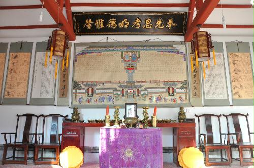 许氏宗祠院落坐东朝西,前后两跨院结构,有北正厅,东、南两处厢房。北正厅正面悬挂有许氏宗谱,一世祖许光业和夫人许张氏的画像摆在正中,后人依次按照辈分排列,堂上挂着“奉先思考 明德惟馨”的牌匾。